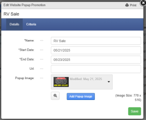 In the RV business, the right timing can make all the difference. Popup Promotion puts you in the driver’s seat, letting you react instantly with no turnaround delay. It eliminates bottlenecks and gives your staff the power to act on opportunities, address problems, and drive results without compromise.